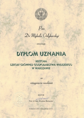 Dyplom uznania dla dra Mykoli Orykovskiego za osiągnięcia naukowe